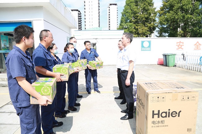 為切實(shí)做好夏季防暑降溫工作,保障高溫期間全體職工的身體健康,確保生產(chǎn)經(jīng)營工作順利進(jìn)行,8月11日下午,安慶港華常務(wù)副總楊善俊、工會(huì)主席韓高中一行來到港華路加氣站、雙井街路段戶內(nèi)管外移作業(yè)現(xiàn)場(chǎng)及北部新城調(diào)峰站等處,看望慰問高溫下始終堅(jiān)守在一線崗位的燃?xì)夤ぷ髡?,并送去冷柜、飲用水和防暑降溫用品,把公司的關(guān)懷送到職工們的心坎里。