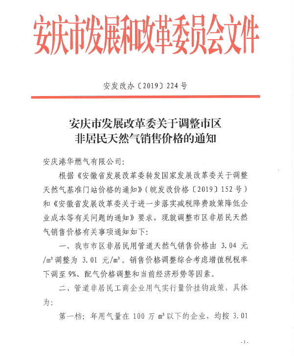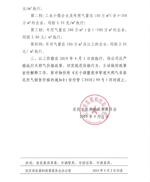 安慶市發(fā)展改革委關(guān)于調(diào)整市區(qū)非居民天然氣銷售價格的通知(2019) 發(fā)布時間:2019-09-10    閱讀次數(shù):10203次