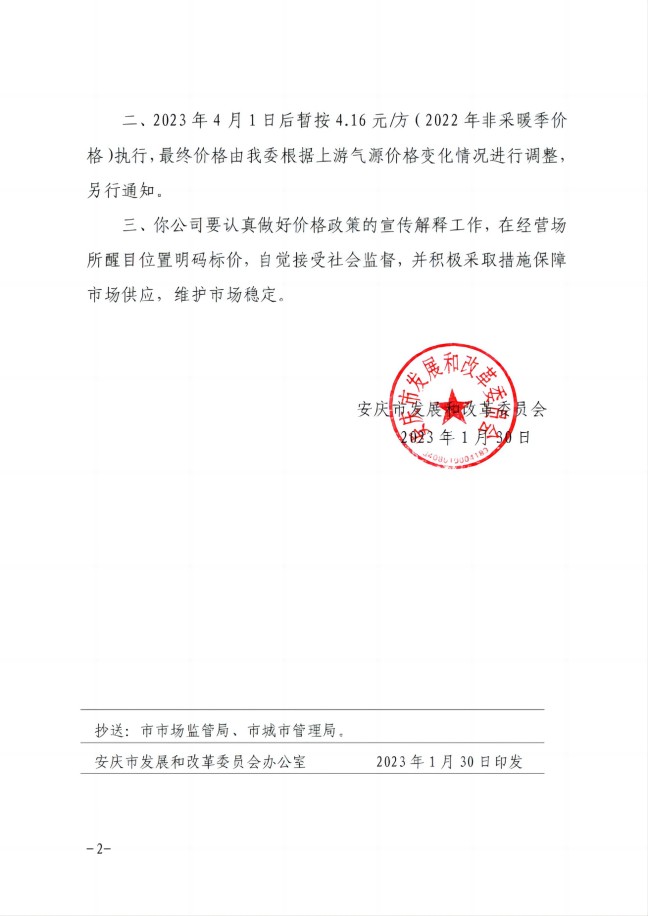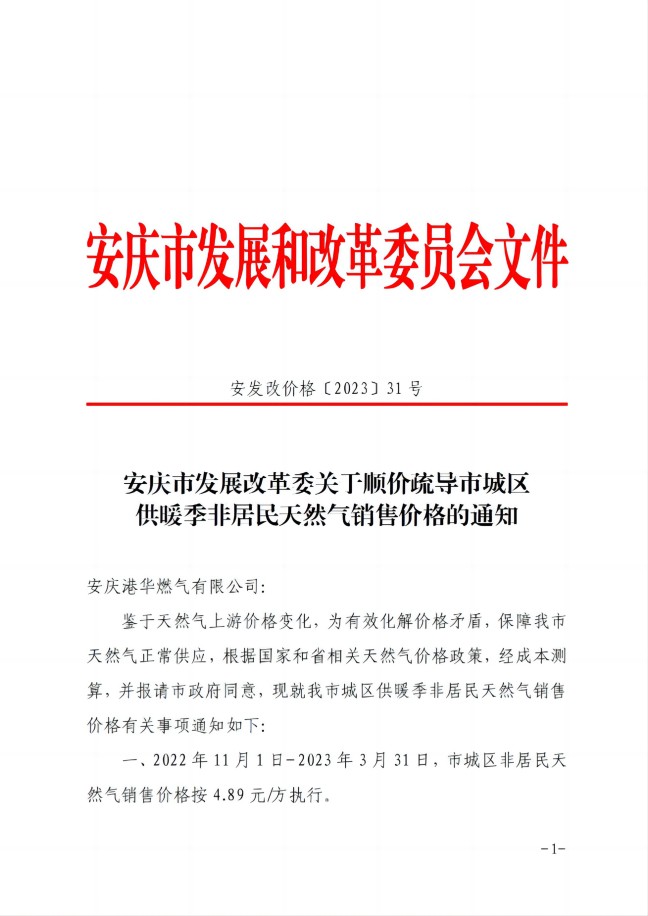 安慶市發(fā)展改革委關(guān)于順價(jià)疏導(dǎo)市城區(qū)供暖季非居民天然氣銷售(2023)價(jià)格的通知-安發(fā)改價(jià)格【2023】31號