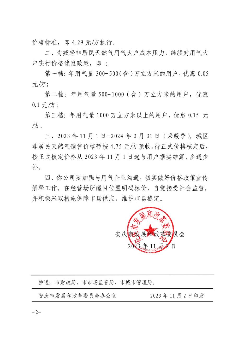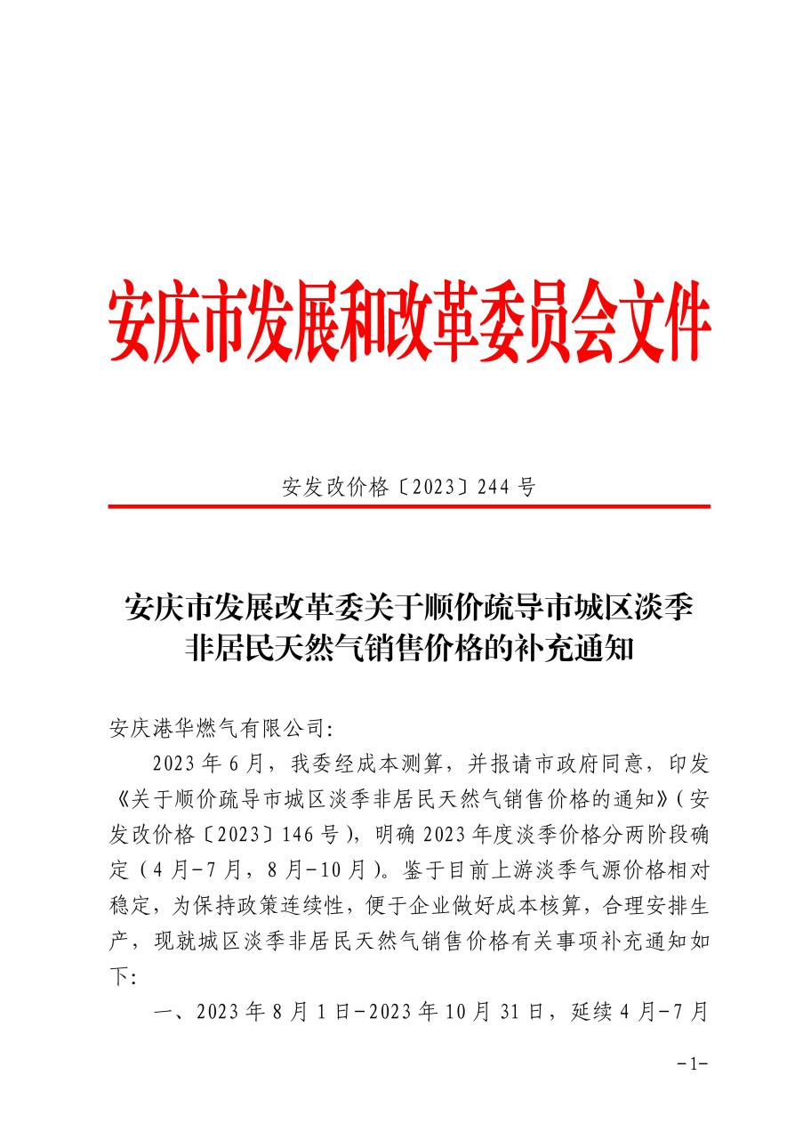 安慶市發(fā)展改革委關(guān)于順價(jià)疏導(dǎo)市城區(qū)淡季非居民天然氣銷售價(jià)格的補(bǔ)充通知
