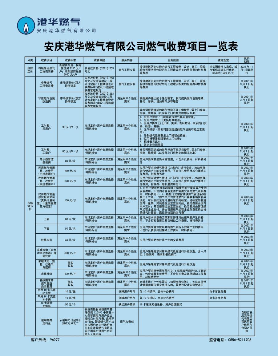 安慶港華燃?xì)庥邢薰臼召M(fèi)項(xiàng)目一覽表(2023)