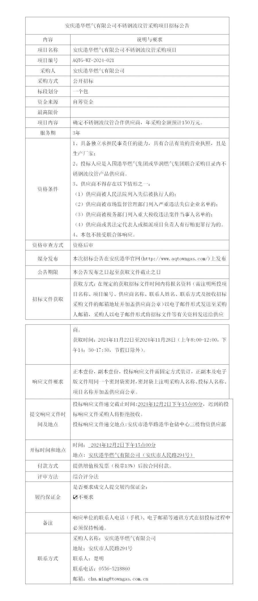 安慶港華燃?xì)庥邢薰静讳P鋼波紋管采購(gòu)項(xiàng)目招標(biāo)公告