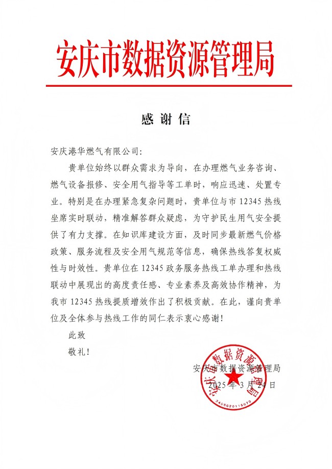 3月24日,安慶市數(shù)據(jù)資源管理局向安慶港華發(fā)來感謝信,對我司2024年燃氣熱線問題辦理的工作成效給予充分肯定。