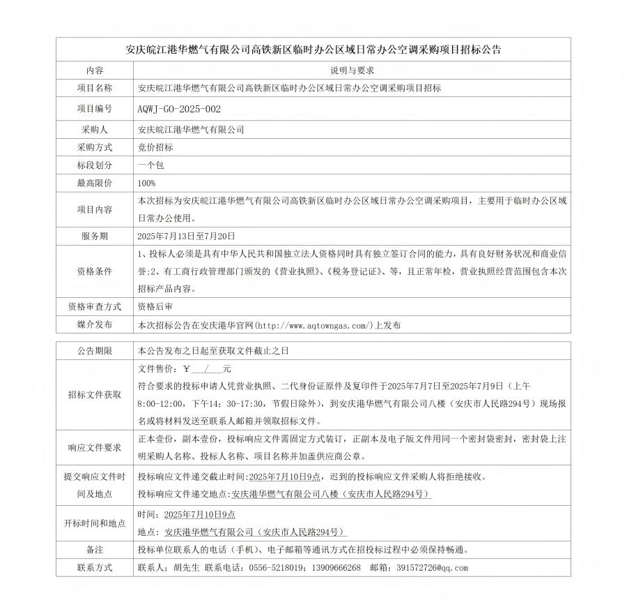 安慶皖江港華燃?xì)庥邢薰靖哞F新區(qū)臨時辦公區(qū)域日常辦公空調(diào)采購項目招標(biāo)公告
