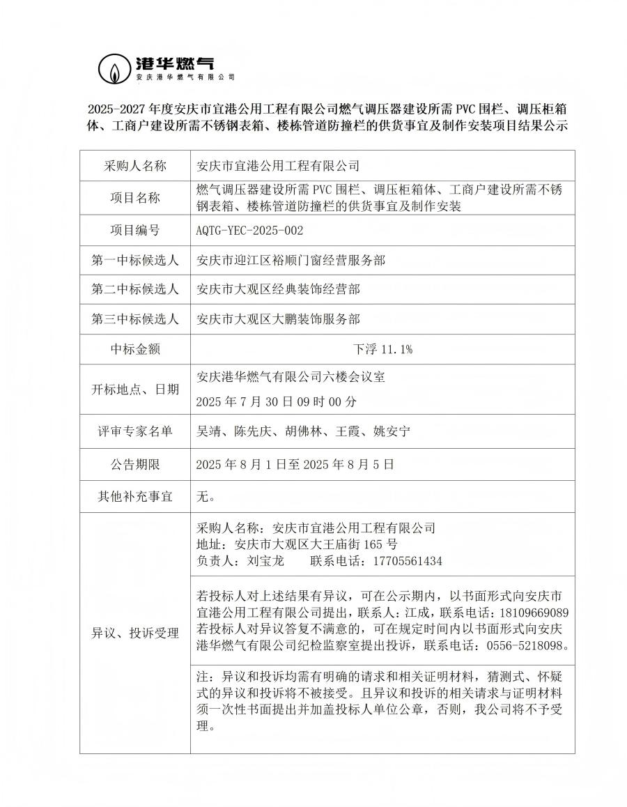 2025-2027年度安慶市宜港公用工程有限公司燃?xì)庹{(diào)壓器建設(shè)所需PVC圍欄、調(diào)壓柜箱體、工商戶建設(shè)所需不銹鋼表箱、樓棟管道防撞欄的供貨事宜及制作安裝項(xiàng)目結(jié)果公示 發(fā)布時(shí)間:2025-08-01    閱讀次數(shù):1510次