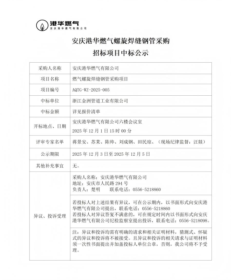安慶港華燃?xì)饴菪缚p鋼管采購招標(biāo)項目中標(biāo)公示