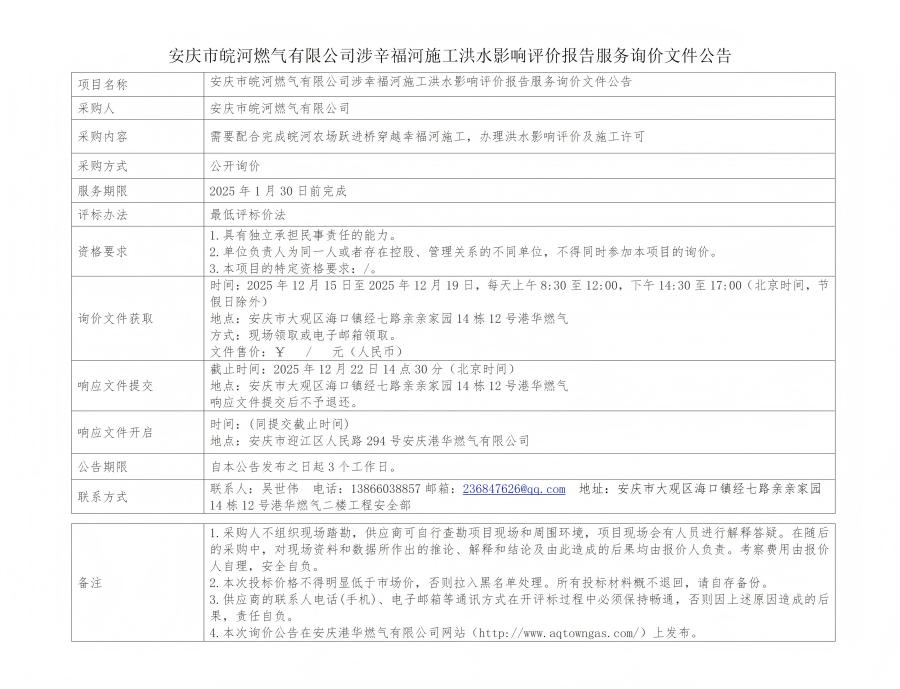 安慶市皖河燃?xì)庥邢薰旧嫘粮:邮┕ず樗绊懺u(píng)價(jià)報(bào)告服務(wù)詢(xún)價(jià)文件公告