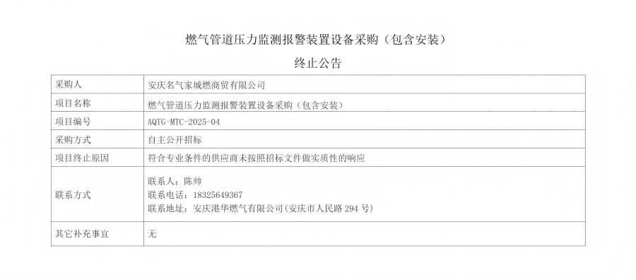 燃?xì)夤艿缐毫ΡO(jiān)測報警裝置設(shè)備采購(包含安裝)終止公告